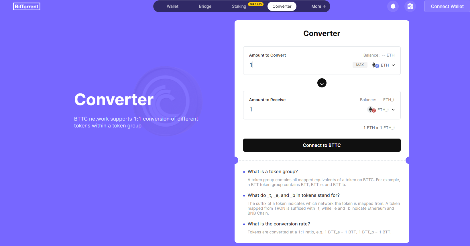 此外,BTTC还推出1:1同类代币转换器Converter,支持BNB Chain、Ethereum和TRON网络上同类资产的无费用互换,例如1ETH_e(以太坊)可1:1兑换为1ETH_b(BNB Chain)。