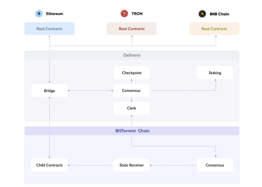 BitTorrent Chain(执行层):DApp应用运行平台,处理跨链消息、验证、同时接收Delivery层的快照,执行资产释放、合约触发等操作。
