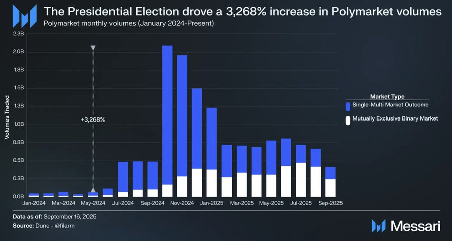 2024 年选举使得 Polymarket 的交易量从 5 月的 6200 万美元飙升至 10 月的 21 亿美元,增长了 3268%。