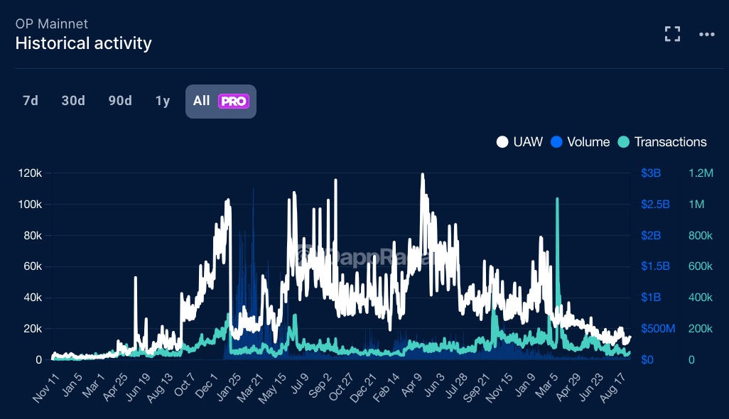 Optimism 提供了一个有益的比较。它没有选择一次性的大规模事件,而是自 2022 年以来分阶段进行空投。2023 年的第二波空投分发了 1100 万枚 OP 代币,目标是 DAO 投票者和代表等治理参与者。与 Arbitrum 相比,这种方法产生的活动高峰较小,但它更有目的地对齐了激励,加强了 Optimism 的治理结构。我们的数据证实,Optimism 在领取期也经历了 UAW 和交易量的急剧跳升,尽管活动消退得更快。OP 代币自推出 3 年以来损失了 42% 的价值。