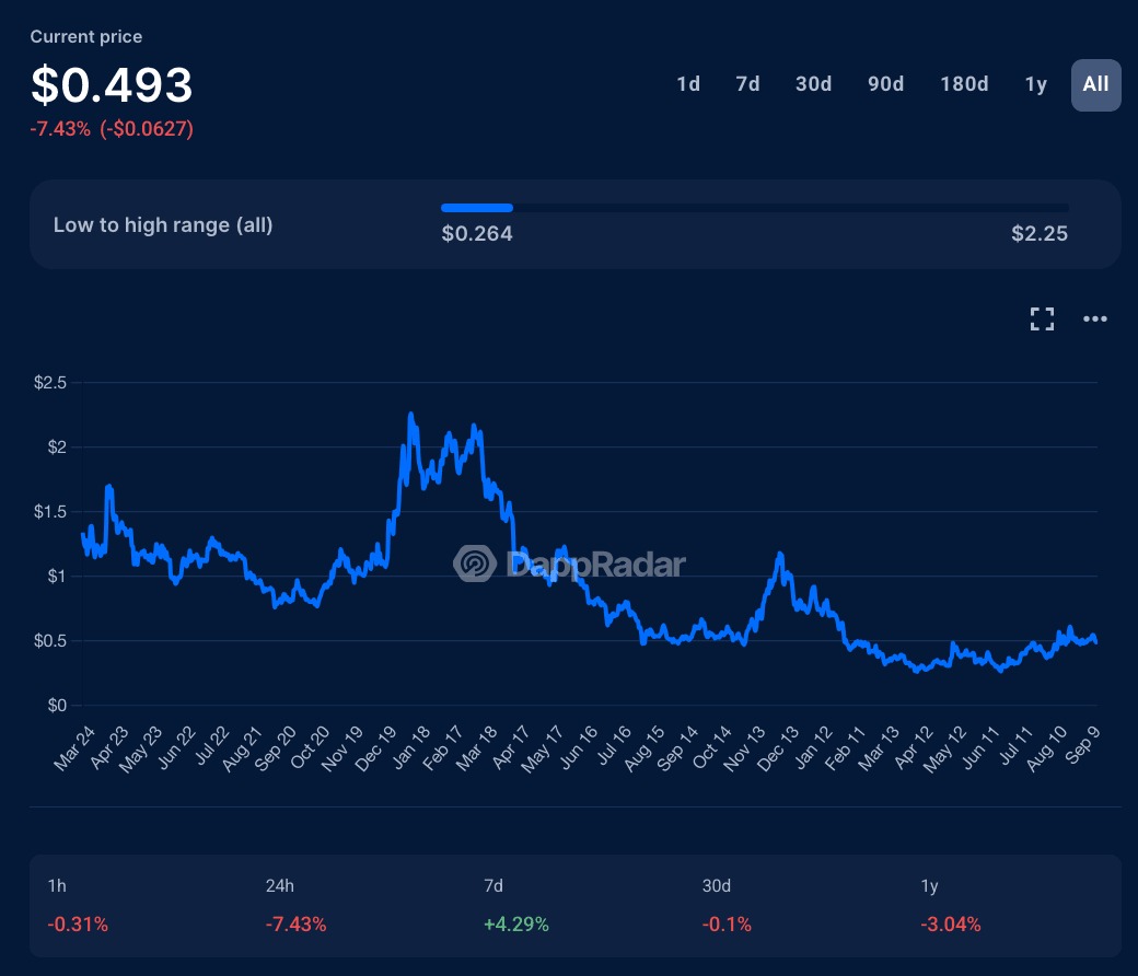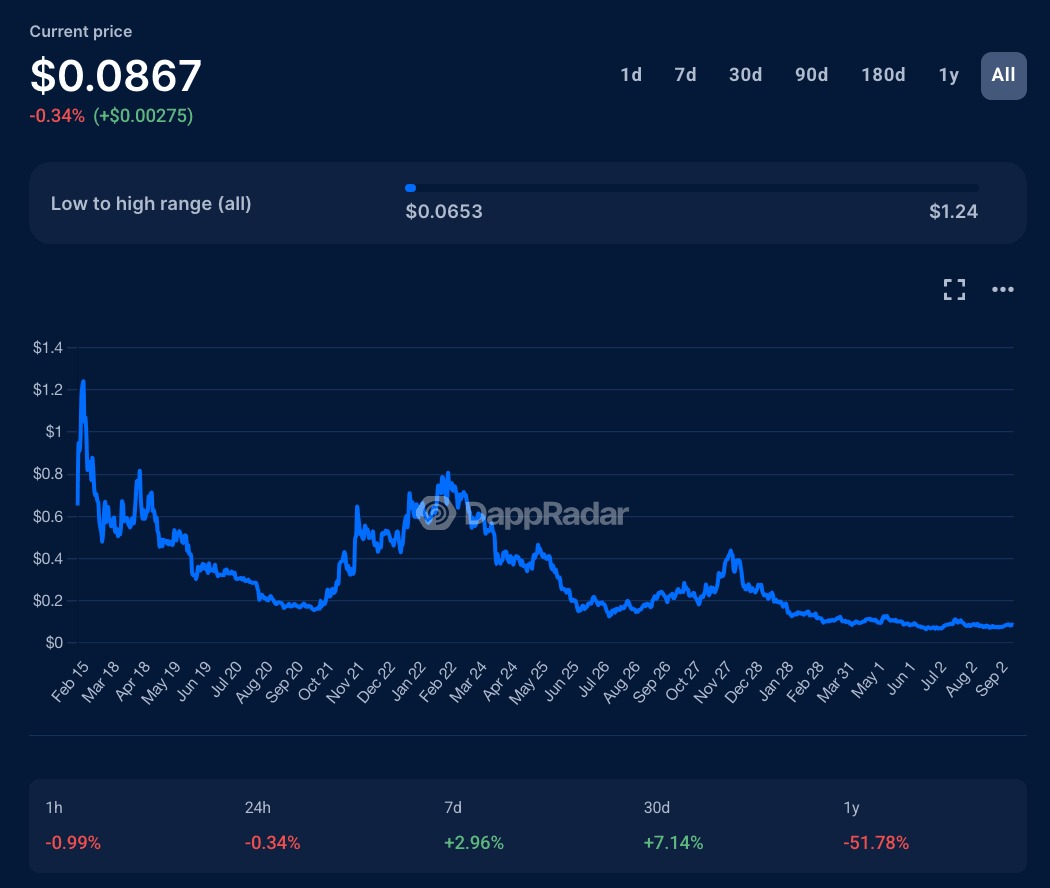 BLUR 代币本身遵循了熟悉的轨迹。它首次亮相时约为 $1.20,但随着领取者抛售而迅速下跌,到 2025 年已跌至 $0.10 以下。即使持续的奖励季度也未能阻止价值的逐渐侵蚀。到 2023 年底,Blur 的市场份额也开始下降,在初始激增后稳定在 20% 至 40% 的范围内。
