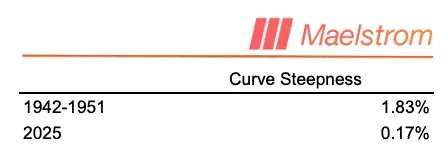 布法罗·比尔·贝森特(BuffaloBill Bessent)旨在推动美国再工业化,试图延缓“美利坚治世”从准帝国向纯粹强权民族国家不可避免的衰落进程,这一计划并非新创。二战时期的紧急状况曾让财政部在1942至1951年间接管美联储。贝森特方案的部分内容涉及收益率曲线重塑,即收益率曲线调控。该时期的收益率曲线形态与当今相比有何异同?