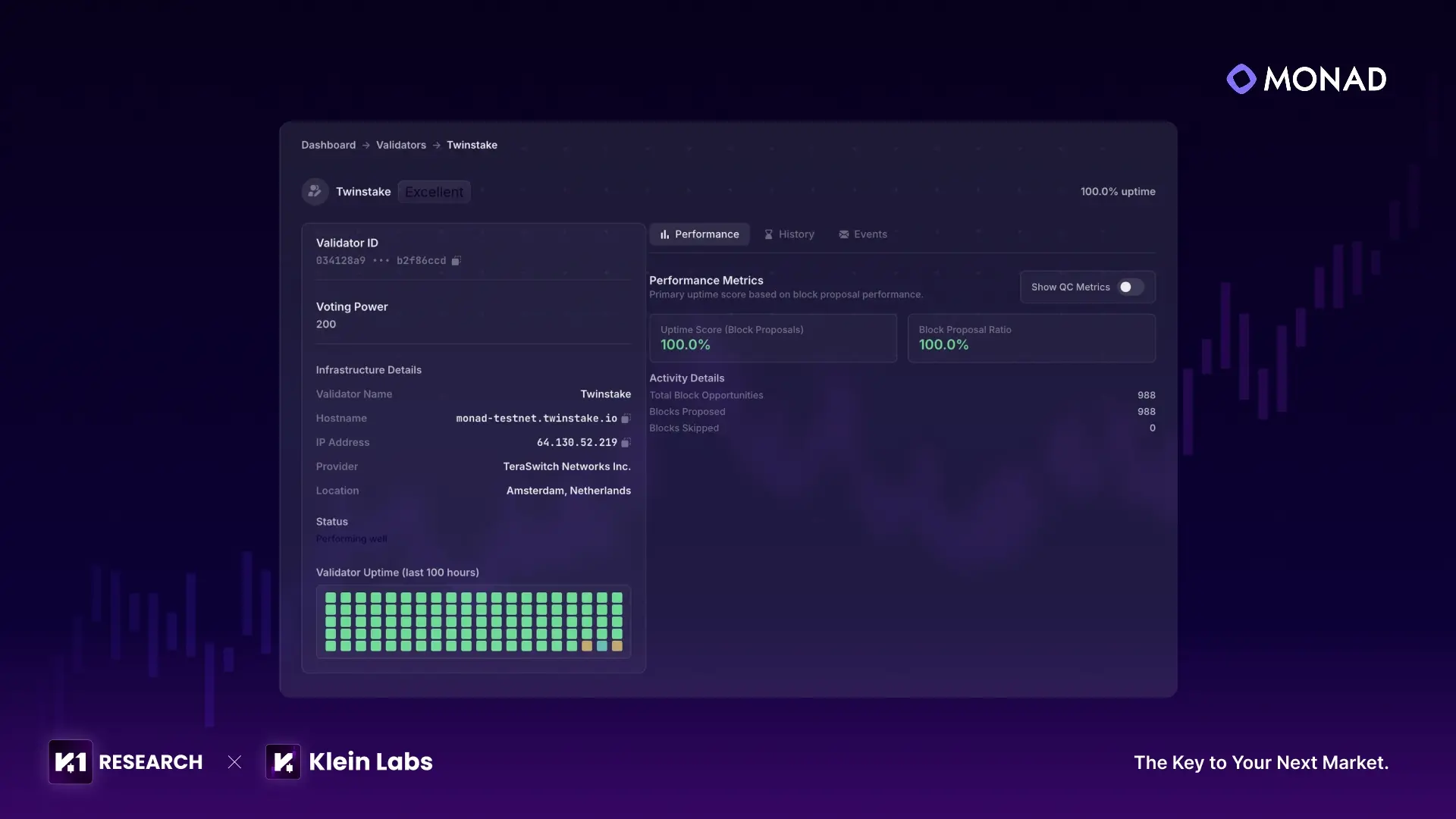 交易吞吐与成功率:Monad Testnet Overview Dashboard显示,截至 2025 年 8 月底,测试网累计处理约 2.55 亿条成功交易,近 90 天平均成功率为 98.18%。机构验证者 Twinstake 的节点在 Testnet-2 中实现 100% 出块率和 100% 出块提案率,验证网络平均出块率约 98.75%,说明在高性能目标下仍保持了稳定的共识效率。