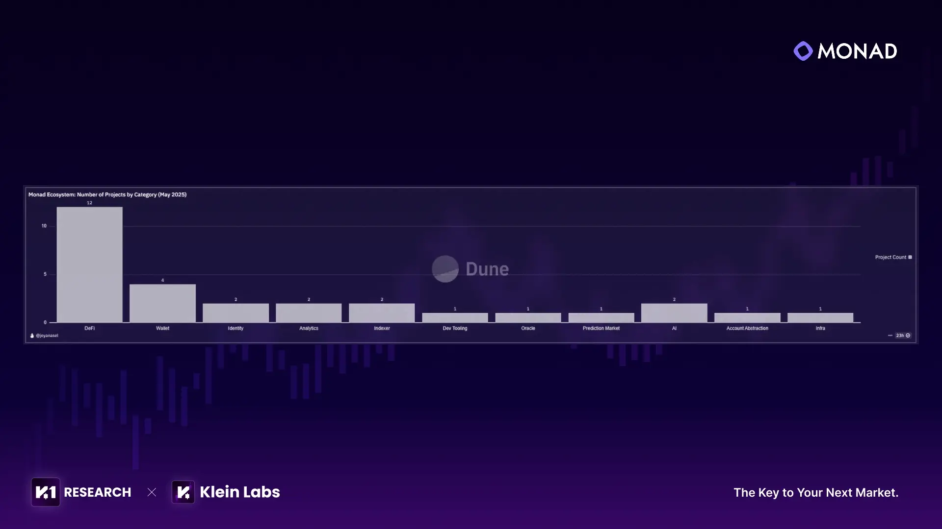 Monad 生态呈现“DeFi 为核心,多赛道协同延伸”的格局:DeFi 类项目以 12 个的数量领跑,成为生态最活跃的核心赛道;钱包(Wallet)作为用户触达生态的关键入口,聚集了 4 个项目;同时,身份(Identity)、数据分析(Analytics)、基础设施(Infra)等“底层基建型” 赛道,以及 AI、预测市场(Prediction Market)等创新赛道均有项目落地,体现出生态从 “核心金融场景” 向 “底层支撑 多元应用” 的拓展逻辑。