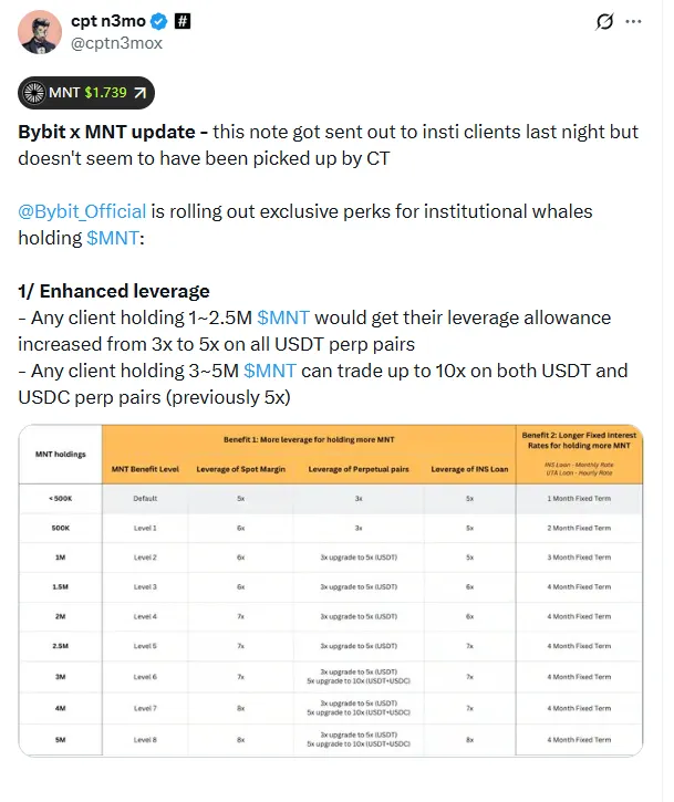 持有 100–250 万 MNT → USDT 永续合约杠杆从 3 倍提升至 5 倍。