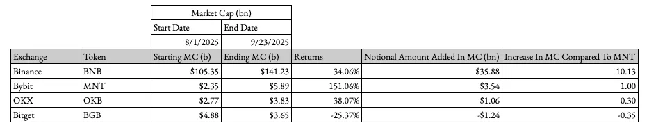 以 Bybit 年收入约 40–50 亿美元计算,这可能每年带来超过 5 亿美元的 MNT 代币需求。这种需求不同于投机性叙事,费用折扣带来了永久的结构性购买压力,正如 BNB 的持续表现所证明的那样。