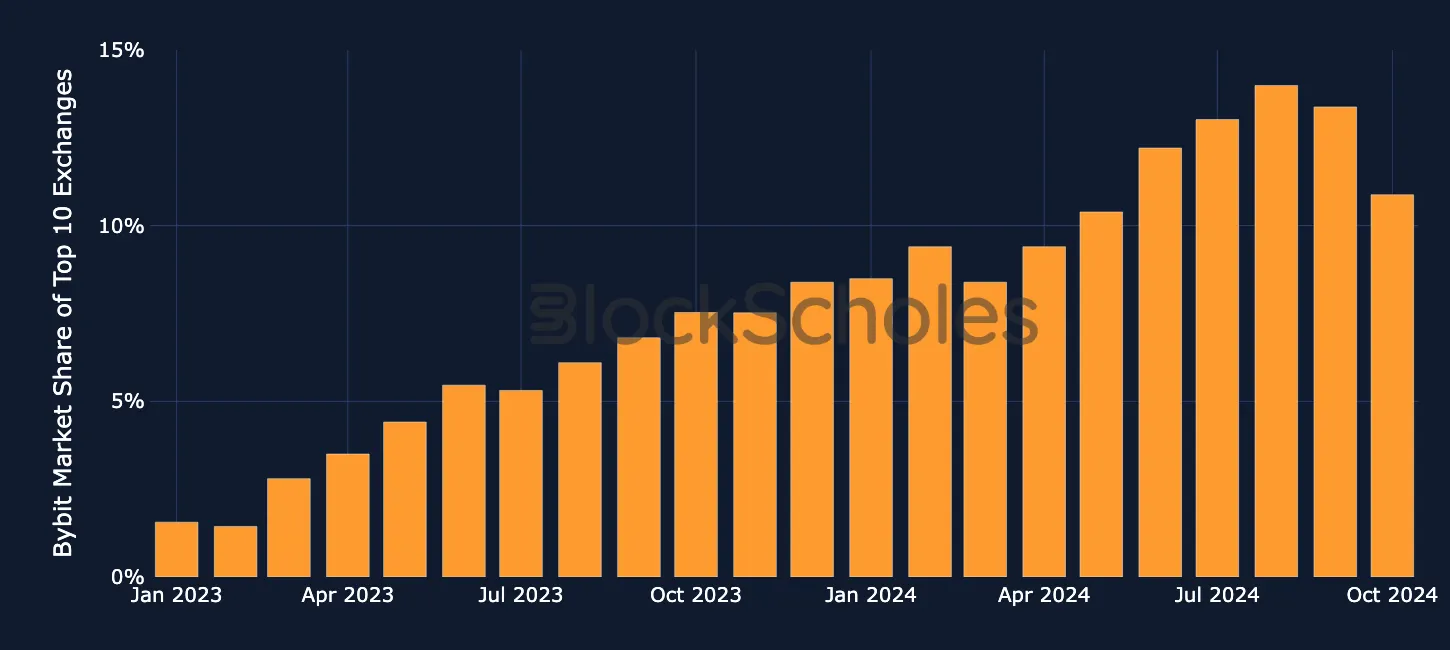 按交易量计算,Bybit 的市场份额占前十大中心化交易所市场份额的比例