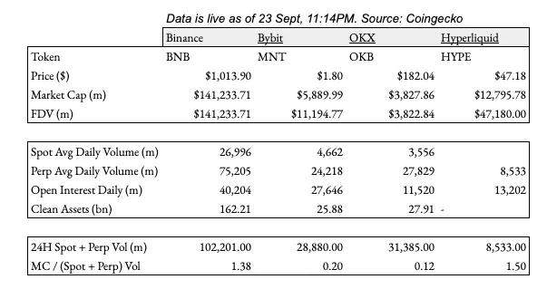 这引出了一个完美的切入点——讨论 Bybit 和 Mantle 在其他中心化交易所(CEX)中的定位。尽管交易所代币正在经历行业范围内的升值,但显著的估值差异已经出现。对主要交易所代币的比较分析显示,尽管基础业务指标相似,MNT 的交易价格却远低于同行。