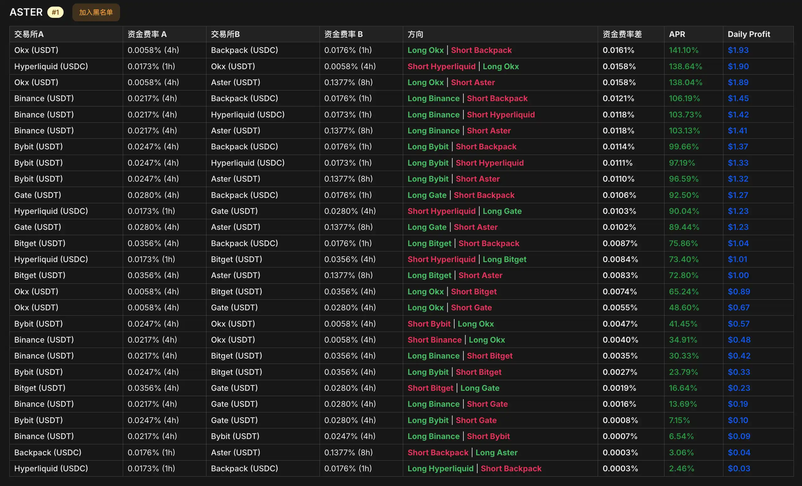 继续按照之前的 Backpack(限价挂单) Aster(市价吃单)方式做现货对冲,赚取积分。净收益为 = 积分价值 资金费率收入 - 手续费成本 - 滑点损失。
