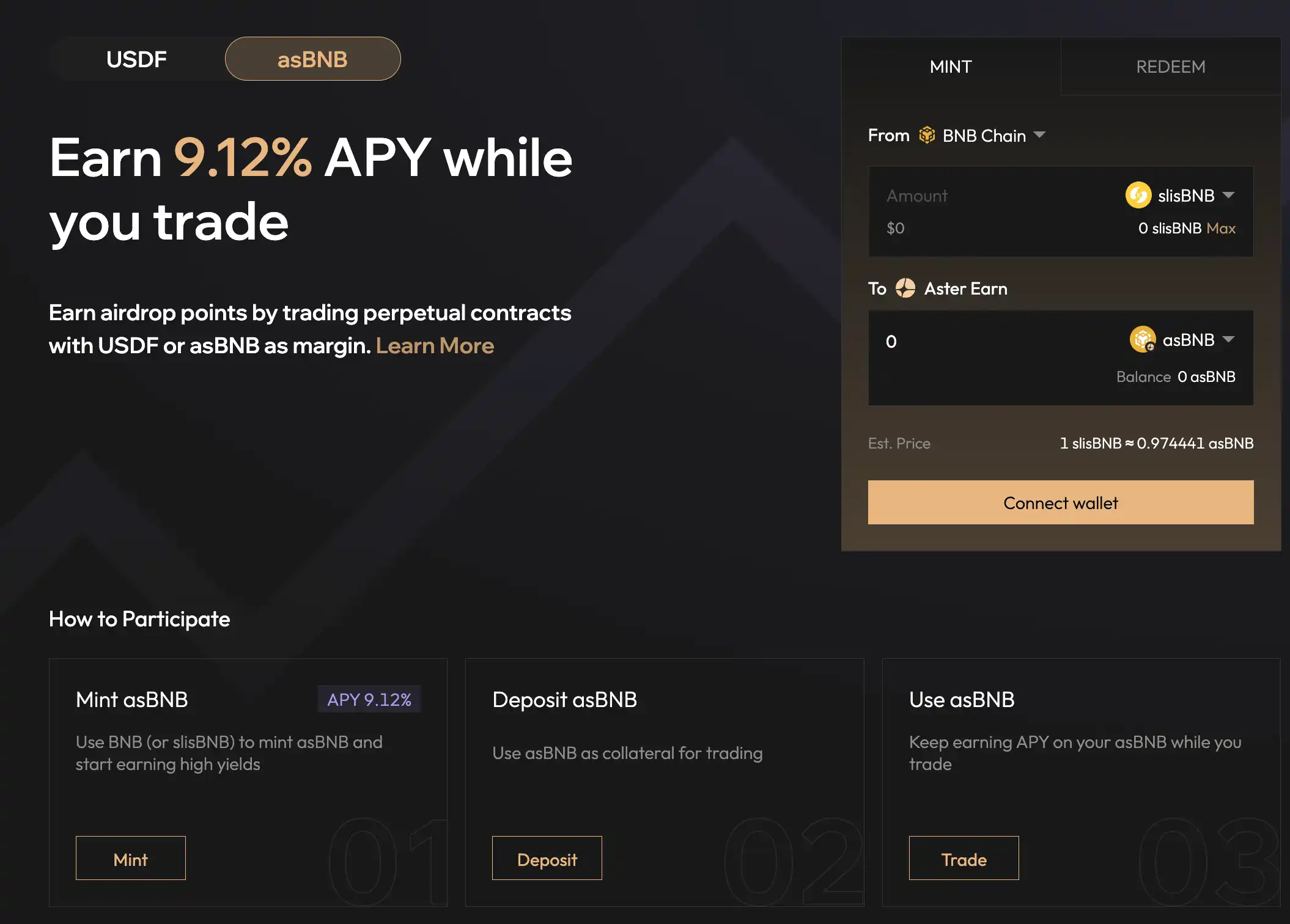除了 USDF,Aster 还提供 asBNB 这一资产,作用和逻辑与 USDF 类似。用户可以用 BNB 或 slisBNB 兑换为 asBNB,作为保证金使用,同时享受 约 9.1% 的年化收益。