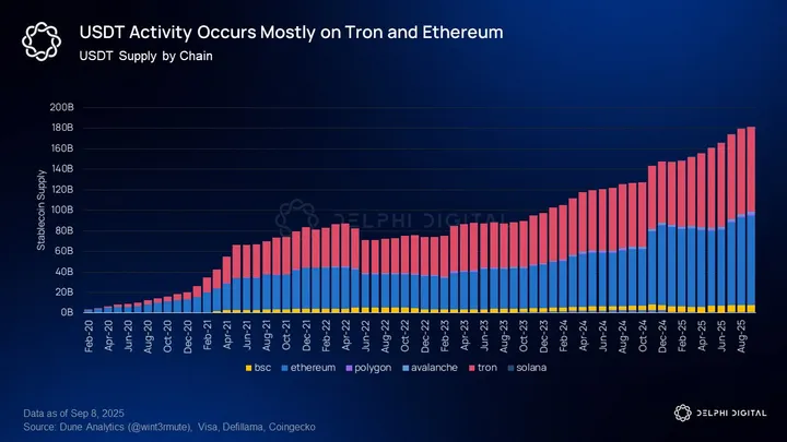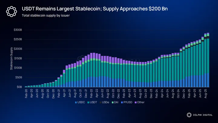 USDT 是中心化交易所 (CEX) 上规模最大、流动性最强的稳定币。USDC 在 DeFi 领域备受青睐,拥有众多集成项目,是 DEX 流动性的主要交易对,并且在支付领域发展势头强劲。尽管稳定币的设计空间不断扩大,且市场兴趣日益浓厚,但 USDT 的市场份额仍在不断巩固,供应量接近 2000 亿美元。
