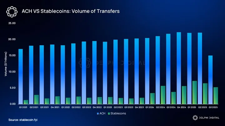 美国银行间转账系统 ACH 每季度的清算金额仍在 20 万亿美元左右,但稳定币正开始迎头赶上。稳定币在 2021 年几乎无人问津,如今每季度处理金额超过 7 万亿美元,稳定币正在逐步侵蚀 ACH 的数字美元结算份额。