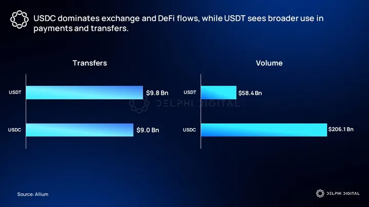 采用规模已经令人震惊。截至 2025 年中,超过 2450 亿美元的稳定币在公链上流通,其中约 62% 为 USDT ,约 23% 为 USDC。2024年,链上结算量将超过15 万亿美元,超过 Visa 的 14.8 万亿美元。