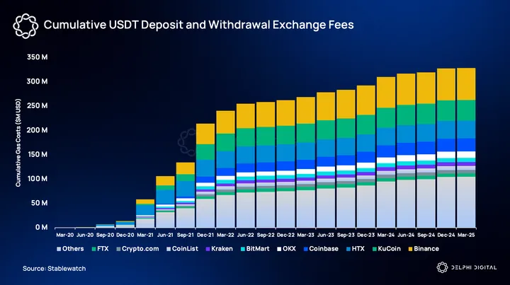 过去五年,用户在中心化交易所 (CEX)提取/存入 USDT的支出超过 3 亿美元。这充分证明了 USDT 免费转账如何为用户选择 Plasma 作为 USDT 枢纽而非其他任何链提供了强有力的契机。