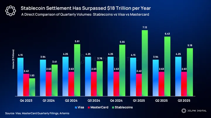 两者的发展轨迹对比鲜明。信用卡网络持续稳步增长,但速度有所放缓。相比之下,稳定币的复合增长速度要快得多,几年前还几乎看不到其交易量,如今已可与传统支付渠道的规模相匹敌。