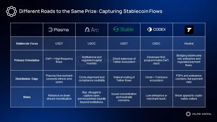 过去一年,专注于稳定币的区块链项目不断涌现,每家公司都意识到美元结算是加密货币的杀手级应用。其中一些项目,例如Arc 和 Codex ,与 Circle 紧密合作,自然而然地青睐 USDC,尽管它们仍然对 USDT 等其他稳定币的流入持开放态度。他们的宣传主要侧重于监管透明度和机构采用,将自己定位为资本市场的合规轨道。