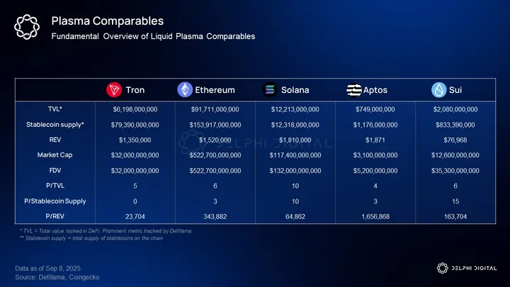 对于 Plasma 来说,最合理的比较对象是 Stable、Arc(Circle)和 Tempo(Stripe)。但这些区块链尚未具备流动性。目前,Tron、Solana、以太坊、Aptos 和 Sui 等高吞吐量且以 DeFi 为主导的区块链是最佳选择。
