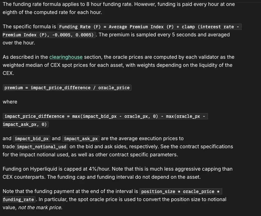 我们直观的从这张图中可以发现,Hyperliquid的资金费率明显高于Binance,那么造成这个情况的原因是什么呢,或者说我们要探索下究竟这个情况是瞬时的交易造成的,还是会持续一段时间,这就要追溯到CEX永续合约市场中资金费率的计算逻辑了。