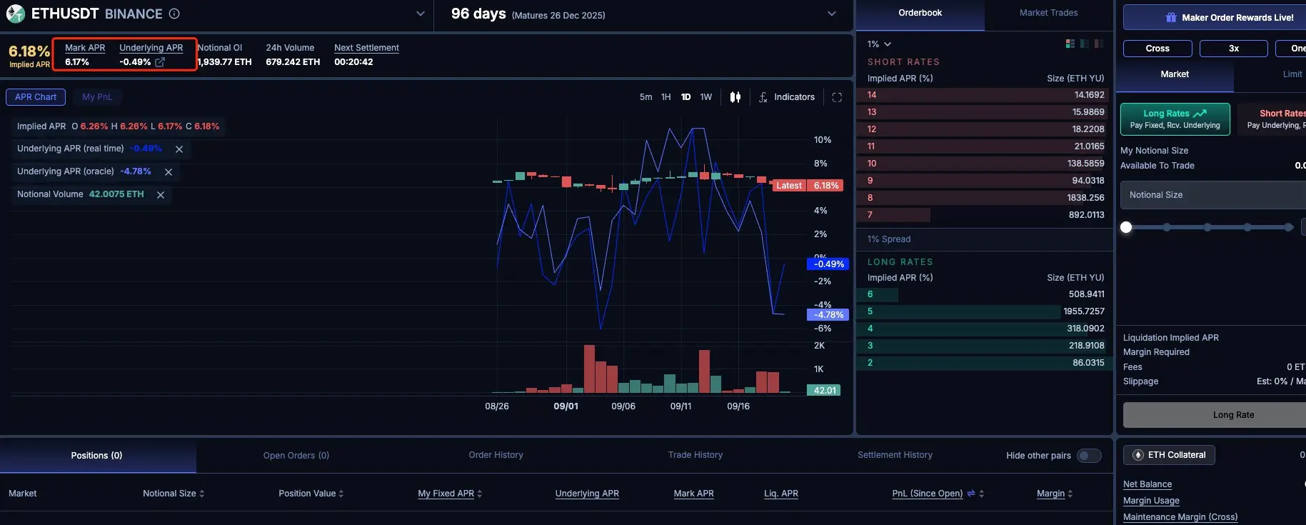 让我们举个例子来说明。假设某个交易者在到期日为2026年12月25日的 ETHUSDT-Binance的YU市场中,买入 5 个 YU 多头仓位,则意味着从此刻起,到到期日之前,你将持续获得5个ETH的空头仓位所获得的资金费率,这部分收益将伴随Binance每8个小时的费率结算而从YU售卖者的保证金帐户中被结算,同时你也会按开仓时的撮合利率,向卖方支付利息。从结果来看,只要在到期日时,你累积支付的利息低于你获得的利息,则此交易是正ROI,反之则亏损。除此之外,加入你在到期日之前,提前选择平仓,你的盈利条件还将依赖你的平仓交易的撮合利率。
