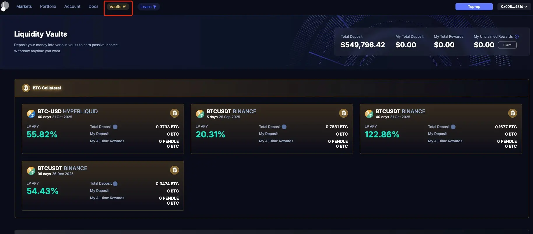 另外从产品前端来看,Boros也设计了一个Vault功能,来丰富流动性来源,通过类似Uniswap V2的DeFi时实现方式,给用户带来一种LP Staking Pool的提供流动性体验,以此降低产品的学习成本,由于关于这部分官方文档还没有给出太详细的解释,我们在这里不展开讨论,不过笔者认为思路应该是将Staking Pool中的资金按照AMM的Bonding Curve形式分布在订单簿中,形成对订单深度的一种补充。但在此市场中提供流动性,可能面临无常损失,所以建议读者等更详细的资料披露后,再选择参与。