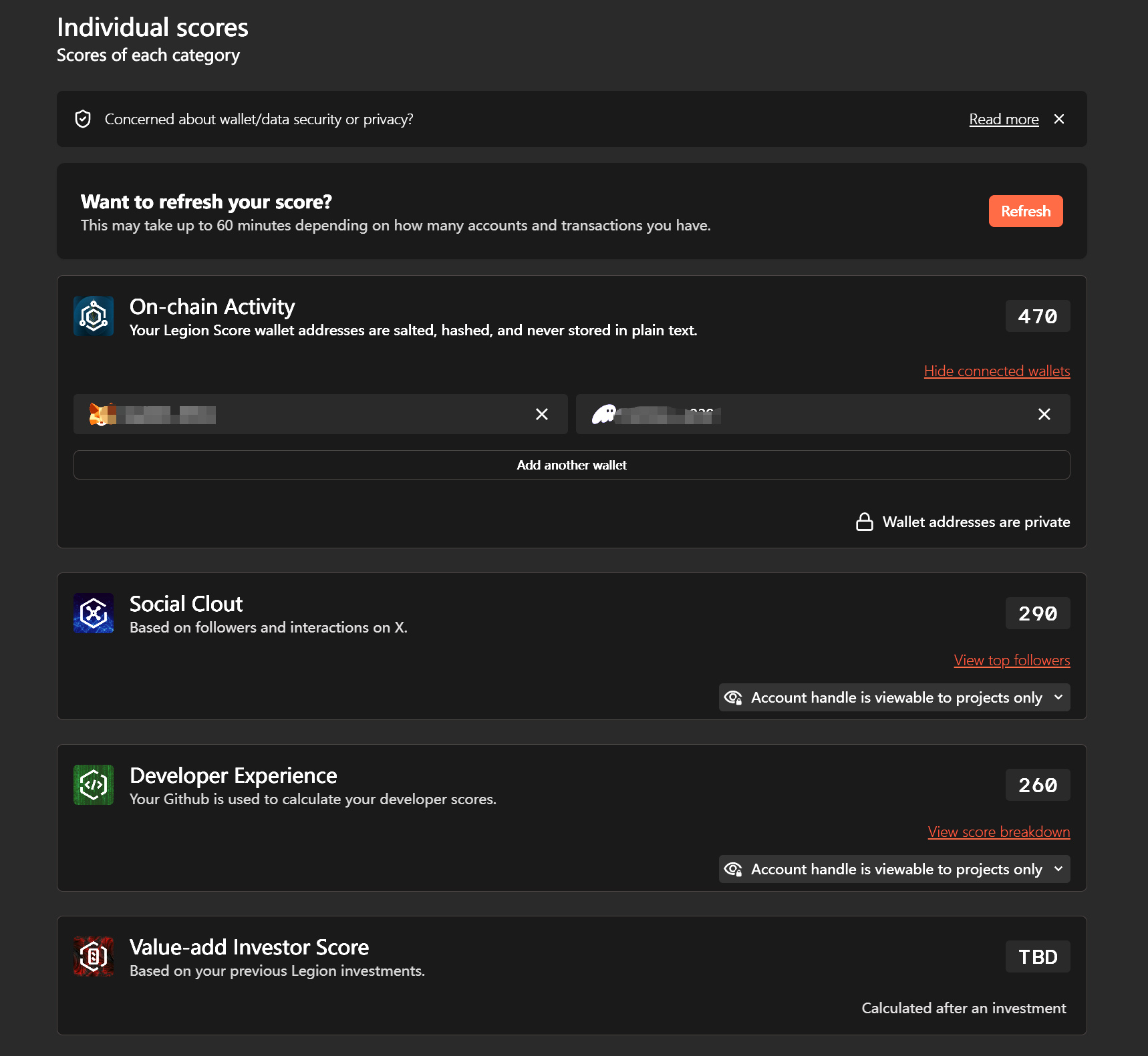 首先是最多20%的预售阶段,此阶段在Legion平台上进行采用Merit-Based分配机制,需要在平台上连接钱包、Twitter、Github等平台账号,Legion将会基于账户的链上活动、社交贡献以及代码贡献综合计算给予用户评分,高评分用户将会在这个阶段获得更高的分配份额。