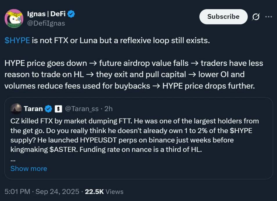 自 Aster 上线以来,HYPE 代币在短短五天内暴跌 27%。更糟糕的是,鉴于大规模 HYPE 代币解锁在即,其后续走势仍不被看好。