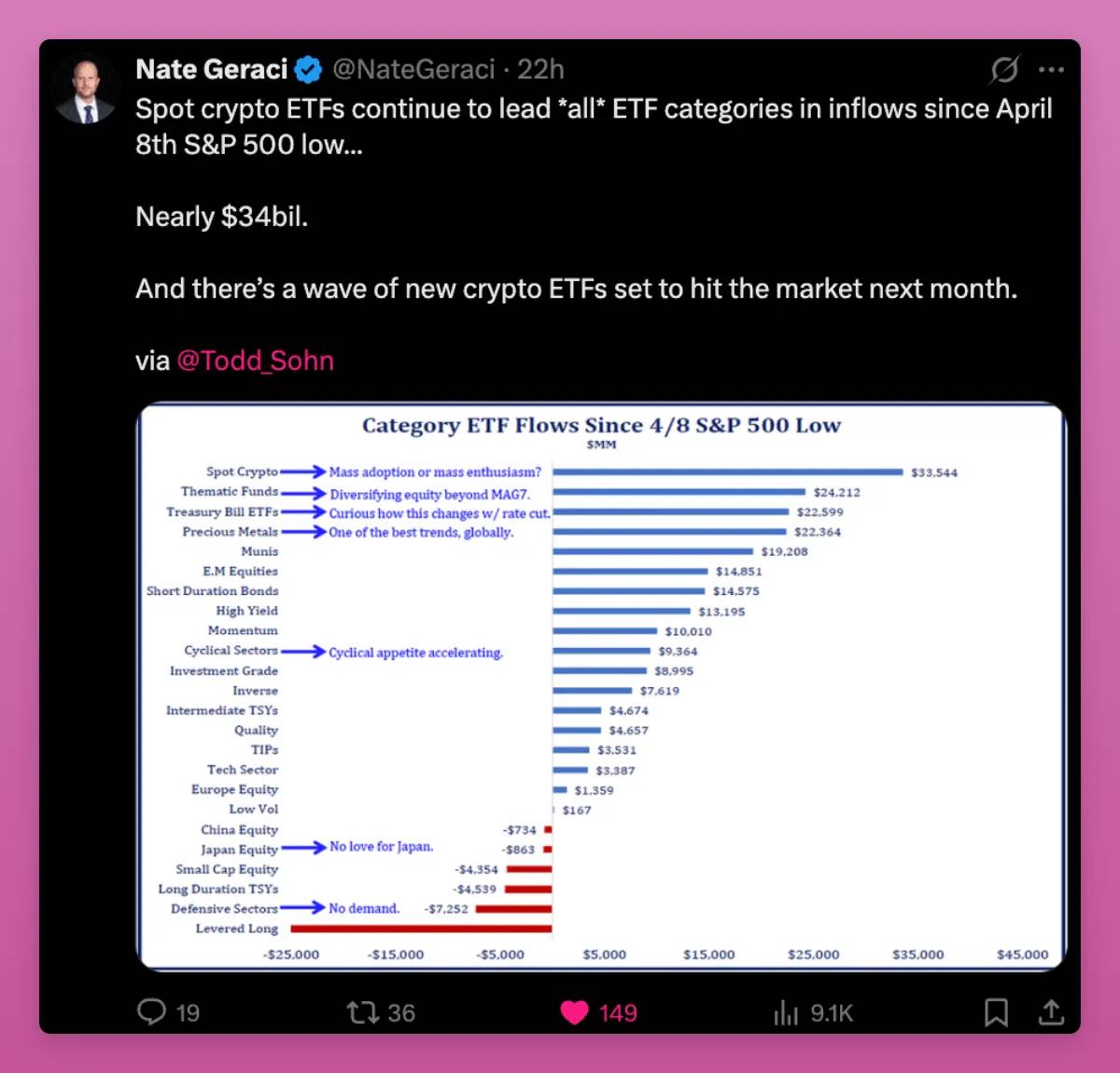 自 4 月 8 日以来,现货加密ETF在所有ETF类别中资金流入领先,达到了 340 亿美元,超过了主题类 ETF、国债和贵金属。