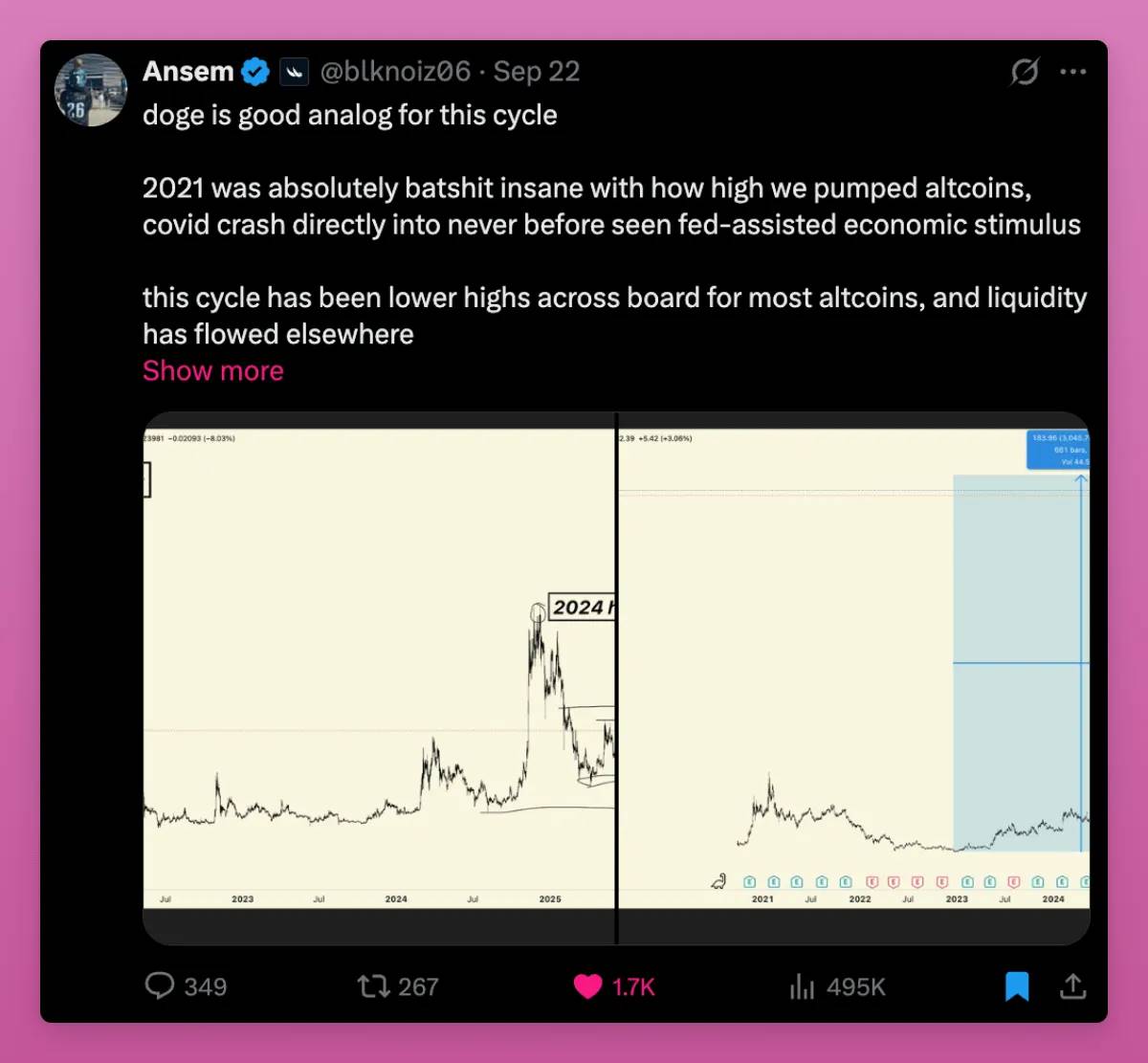 “我担心的是,我们可能已经耗尽了加密原生资本,无法将山寨币推高到超过上一轮周期的峰值。如果我们看2021年第四季度和2024年第四季度的山寨币总名义市值峰值,它们都停留在大约1.2万亿美元左右。考虑通货膨胀调整后,这两个周期的数值几乎完全相同。也许这就是全球散户资本能够为99%‘空气币’出价的极限?”