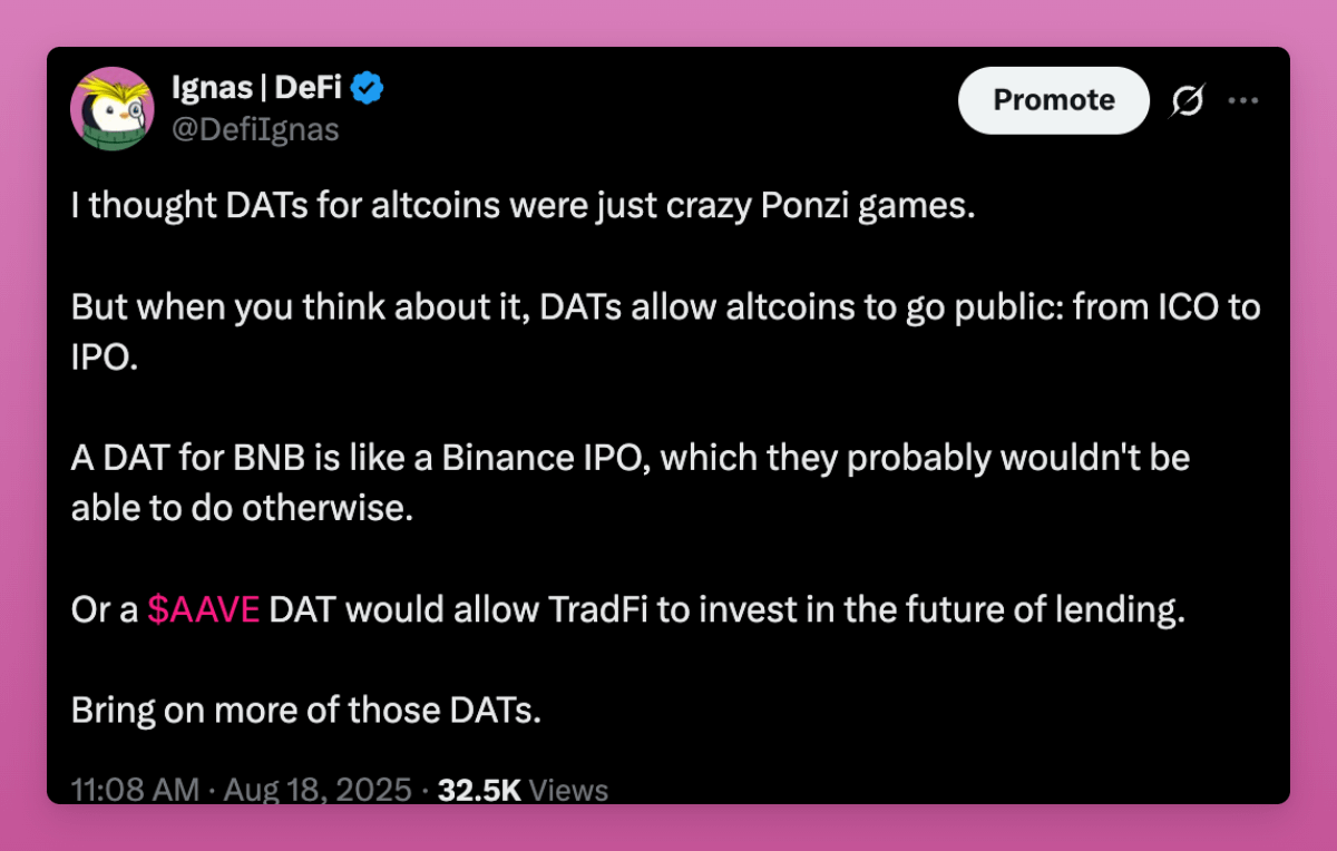 总体而言,DAT 看好加密货币,尤其是那些无法获得 ETF 的代币。它们允许像 Aave、Fluid、Hype 等拥有真实用户和收入的项目将投资转移到股票市场。