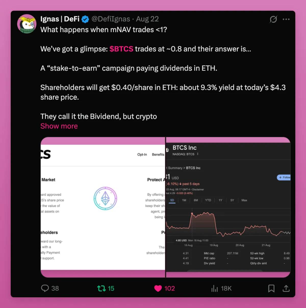 我们举了一个例子,说明当 mNAV > 1 时会发生什么。简而言之,他们将 ETH 发给股东,而这些股东很可能会抛售。然而,尽管进行了“空投”,BTCS 的交易价格仍为 0.74 mNAV。这很糟糕。