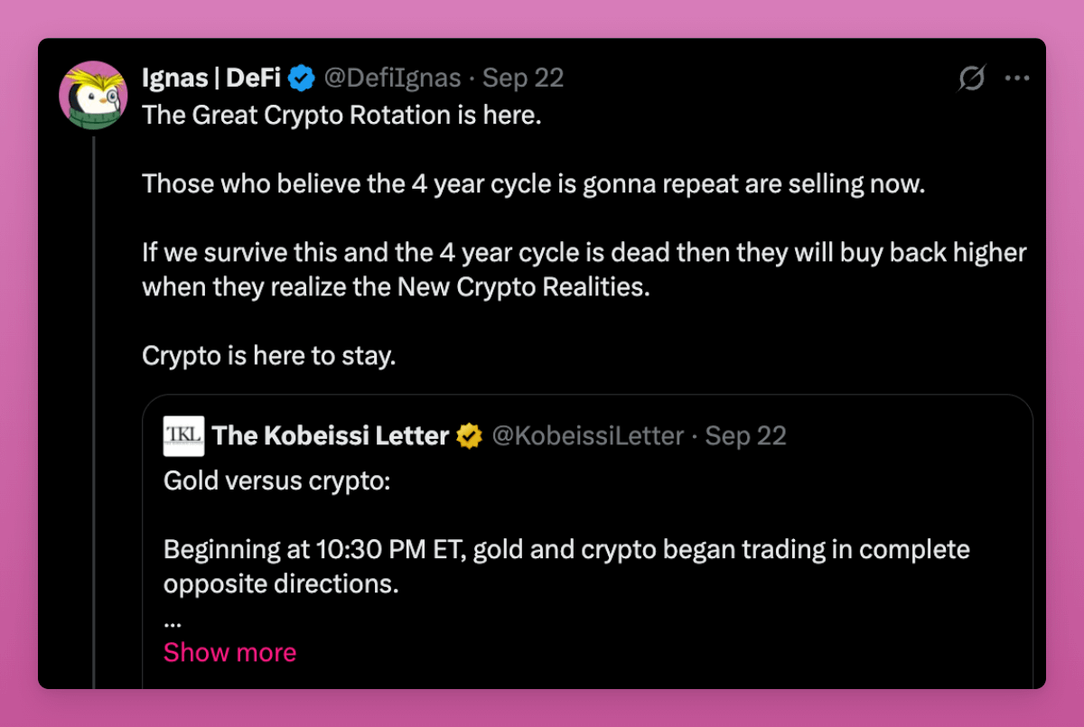 所有权正在发生轮转。相信四年周期的投资者正在卖出,他们期待旧剧本的重复。然而,某些不同的事情正在发生。