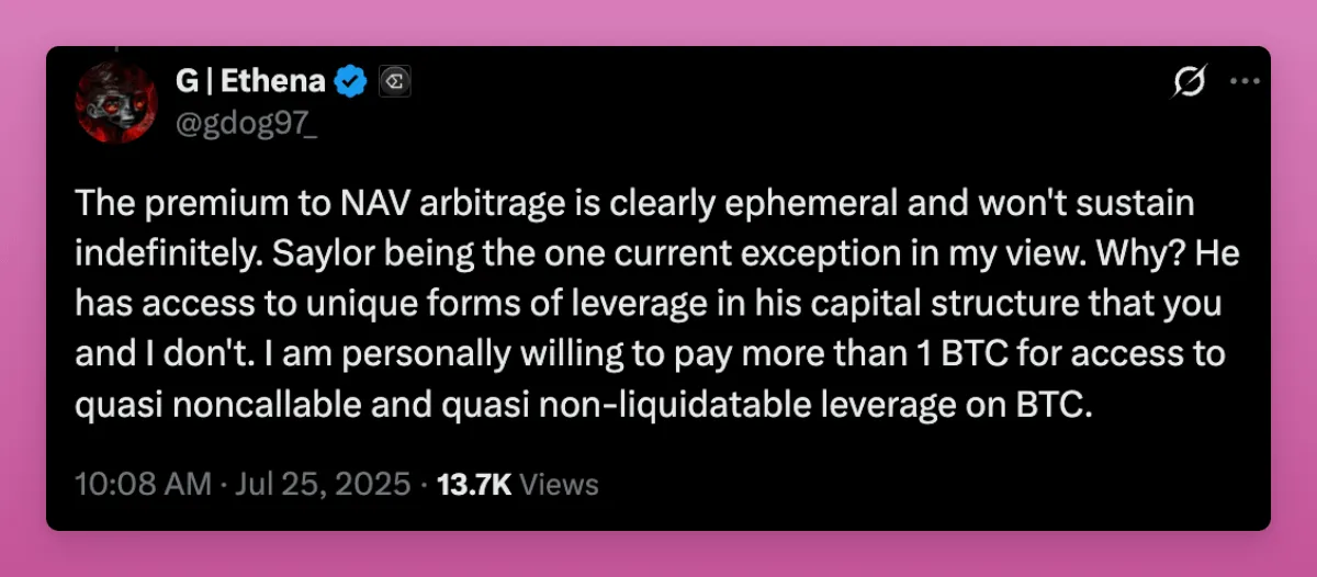 大多数 DAT 无法像 Saylor 那样通过资本结构使用杠杆,持续维持 NAV 溢价。 DAT 的真正价值不在于溢价游戏,而在于获得资本的渠道。即使是稳定的 1:1 NAV 加上持续的资金流入,也比完全无法获得资本要好。