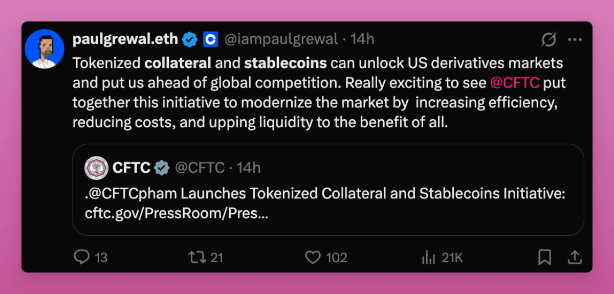 此外,美国商品期货交易委员会(CFTC)刚刚允许使用稳定币作为衍生品中的代币化抵押品。这为资本市场的非现货需求增加了支付需求。