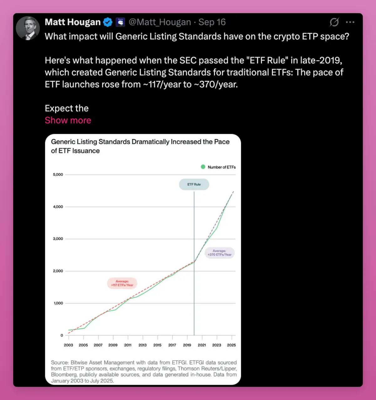 2019 年,类似的规则在股票领域使 ETF 发行数量翻了三倍。预计加密领域也会出现类似情况。许多新的 ETF 即将推出,例如 SOL、HYPE、XRP、DOGE 等,为散户提供退出流动性。