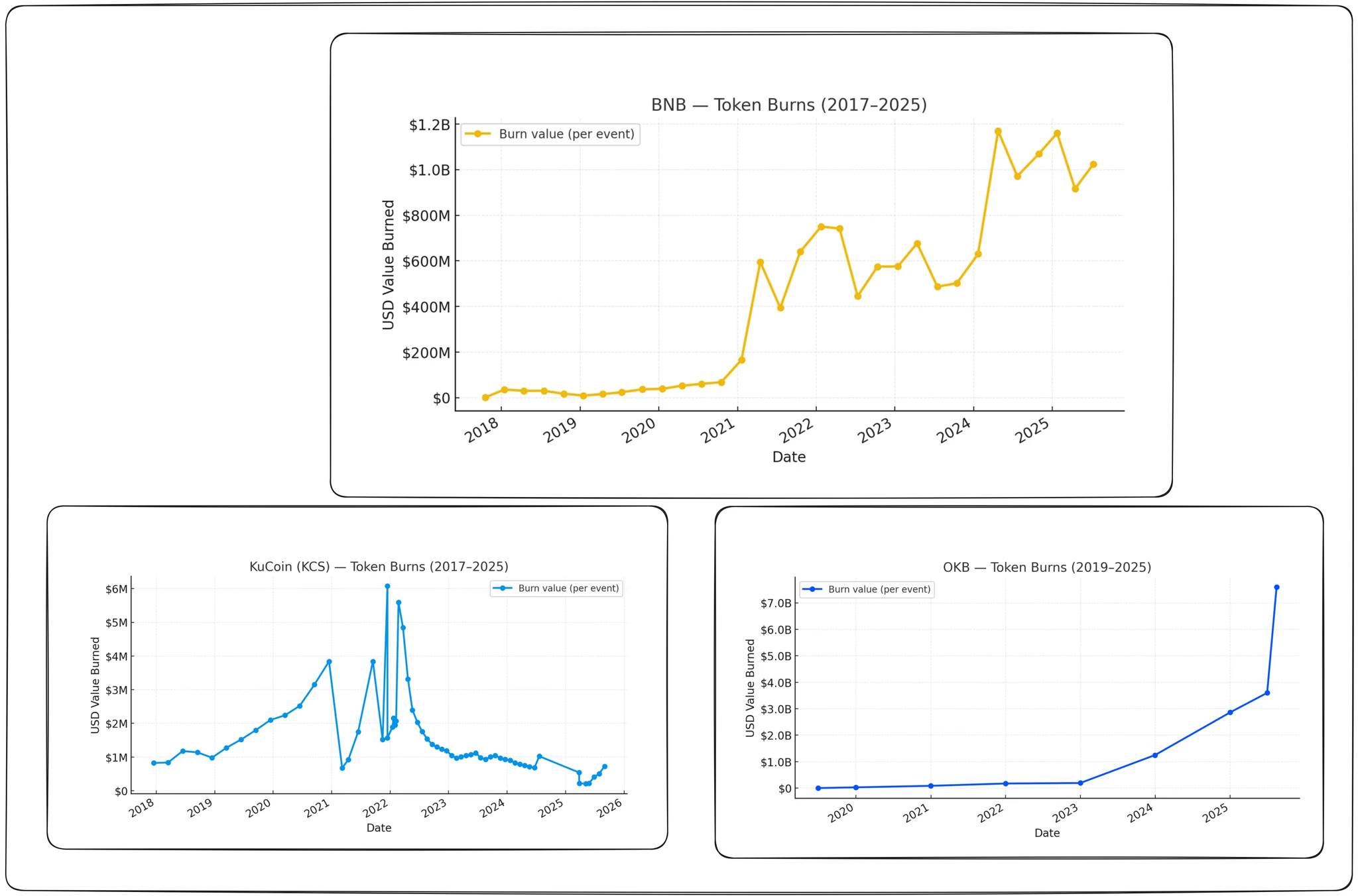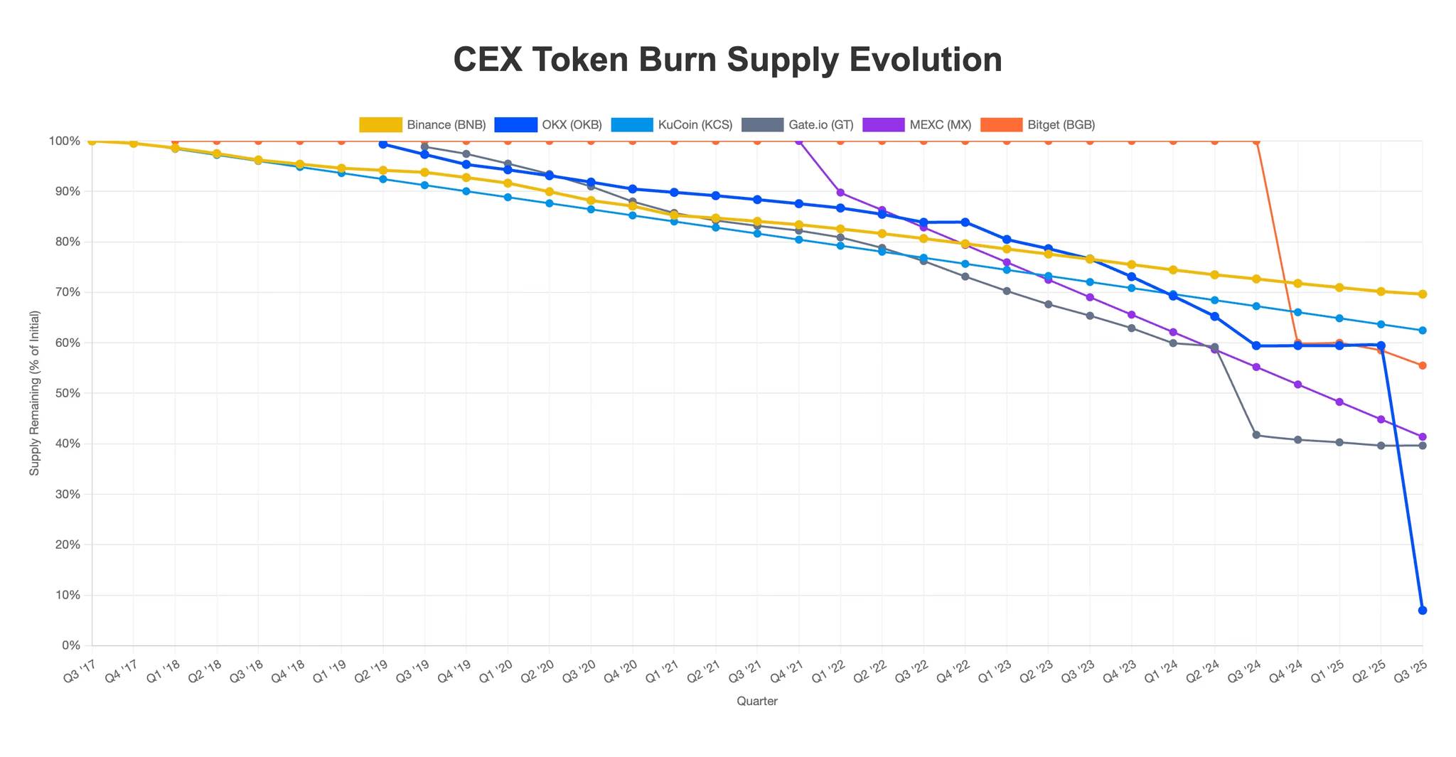这些操作多年来一直在默默进行,早在吸引主流关注之前就已悄然塑造了供需格局。几乎每一个大型中心化交易所(CEX),包括 Binance ($BNB), OKX ($OKB), Gate ($GT), KuCoin ($KCS), 和 MEXC ($MX) 都已实施某种形式的销毁计划且超过五年时间。