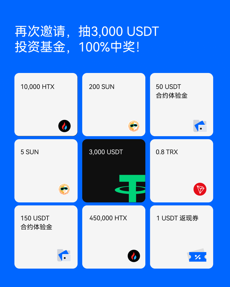 活动期间,再次邀请好友注册并完成任务即可获得抽奖机会,每日最多15次抽奖机会。3,000 USDT投资基金、$SUN、$HTX、$TRX、合约体验金等热门奖品等你来抽,100%有奖。