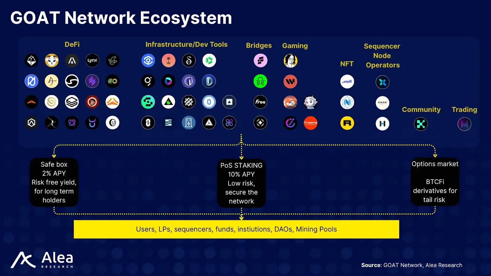 现如今,GOAT Network 的生态版图已经初具规模,覆盖 DeFi、基础设施工具、跨链桥、NFT、游戏、排序器节点等多个方向,吸引了开发者、用户、机构与社区共同参与。随着生态的持续扩展,GOAT Network 正在演变为一个具备可持续收益、开放协作和多元创新的金融操作系统。