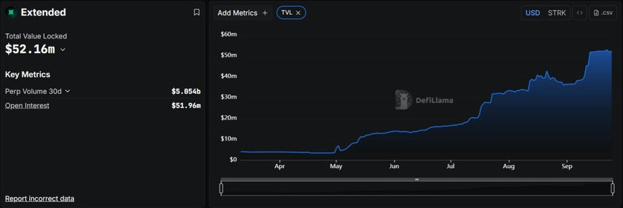 由前 Revolut 团队打造的永续合约 DEX。锁仓量超过 5200 万美元,月永续合约交易量为 50 亿美元。由 Cyber Funds 支持,已筹集 650 万美元资金。Extended 的第一季积分计划已上线,每周分发 120 万积分给用户。