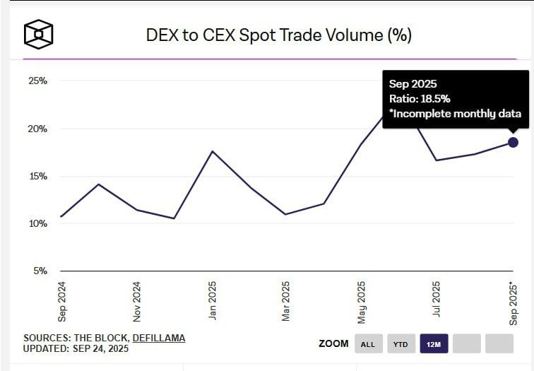 这也促成了 DEX 的迅速增长。2025 年第一季度和第二季度,DEX 的交易量超过 1 万亿美元。DEX 与 CEX 的现货交易量比例达到 20%,几乎是 2025 年 9 月的两倍。