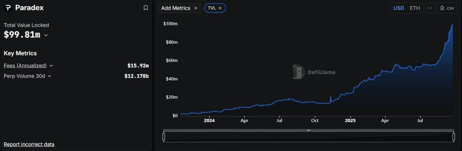 目前总锁仓量(TVL)达到 1 亿美元,月永续合约交易量为 121 亿美元,年化收入达 2000 万美元。