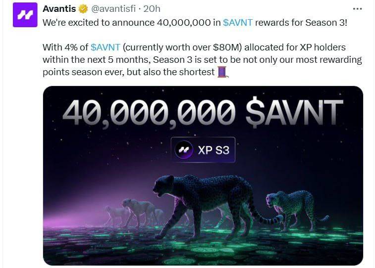 昨日,Avantis 宣布将在第三季结束时空投其总供应量的 4%,时间为 5 个月。