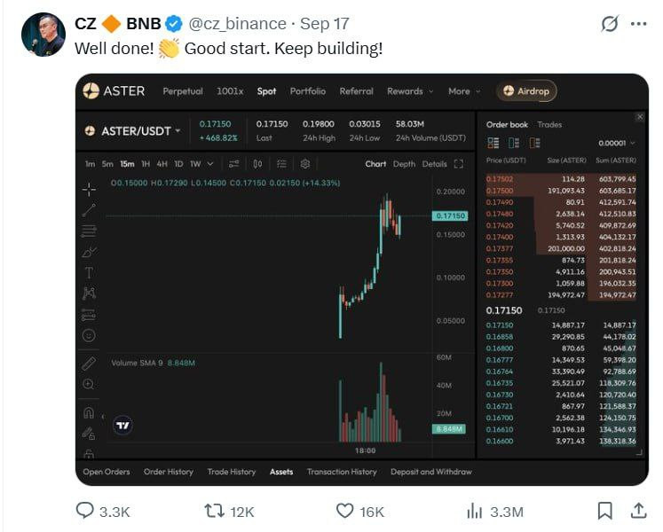 CZ 是 Binance 的创始人,将 Binance 打造成市值 1000 亿美元的公司,吸引了超过 3 亿用户,现在他支持 $ASTER。