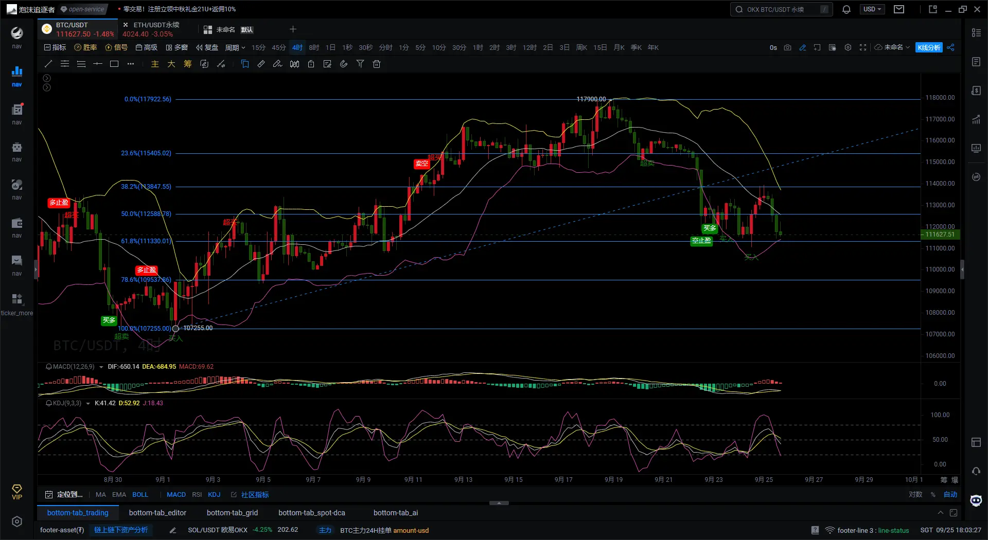 当前价格在111627附近震荡,正处在61.8%回撤位111330的关键支撑区域。上方压力位依次为112588(50%回撤位)、113487(38.2%回撤位)和114505(23.6%回撤位)。下方支撑重点关注111330,若失守可能下探109537,强支撑位于107255的前低位置。目前价格处于多空分水岭,短期走势将取决于能否守住支撑并反弹。