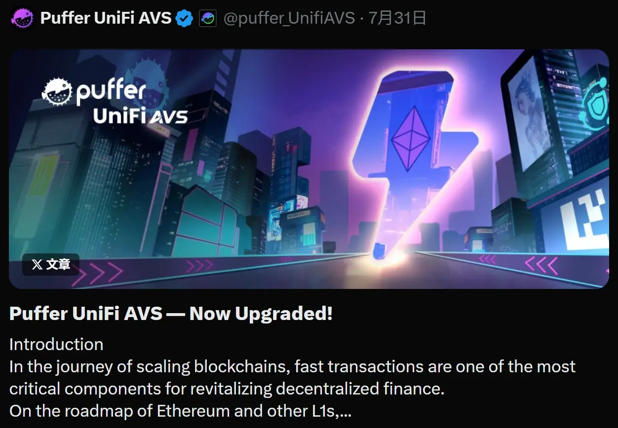 近期,Puffer Finance 推出的以太坊安全基础设施产品「UniFi AVS」,终于试图将 Preconfs 从临时性的性能补丁,升级为可复用的标准化基建,以带来 sub-10ms 的确认速度,并在安全与经济激励层面引入制度化设计。