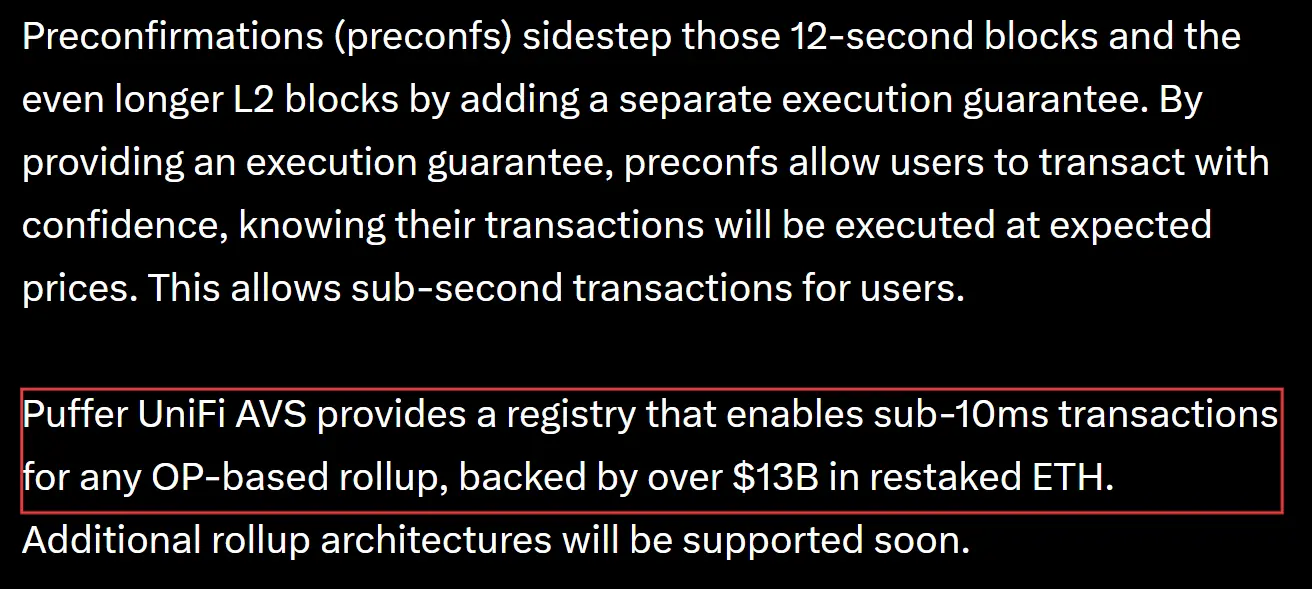 值得注意的是,Puffer 也强调,UniFi AVS 的适用范围并不限于 Based Rollup,从设计上看,其注册表机制同样能够为任何 OP Stack Rollup 提供 sub-10ms 的即时确认能力,并计划在后续支持更多 Rollup 架构,换句话说,它被定位为一套具备跨架构潜力的通用预确认基础设施。