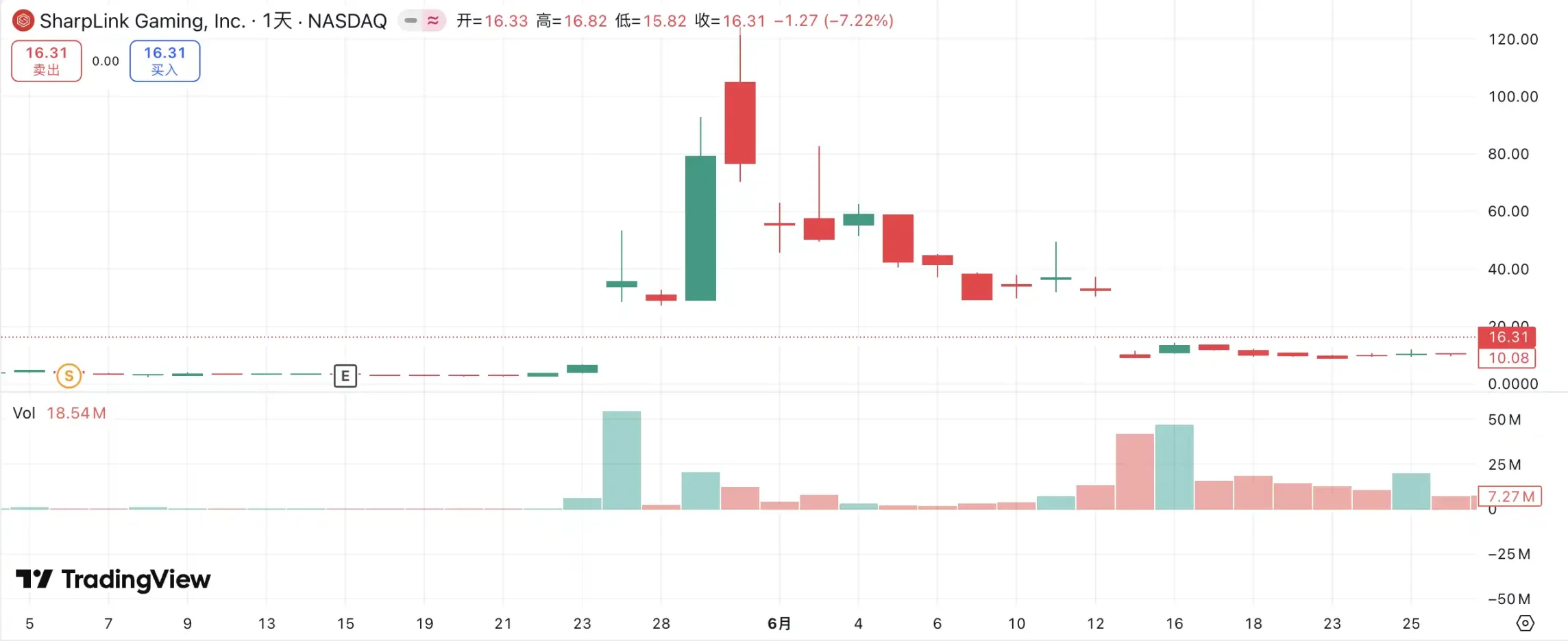 SharpLink Gaming 是这轮「加密财库热潮」中最早引发市场震动的案例之一。5 月 27 日,公司宣布将增持高达 4.25 亿美元的以太坊作为储备资产,消息公布当日,股价一度飙升至 52 美元。然而诡异的是,早在 5 月 22 日,该股的交易量就已显著放大,股价从 2.7 美元跃升至 7 美元,而彼时公司尚未发布公告,也未向 SEC 披露任何信息。