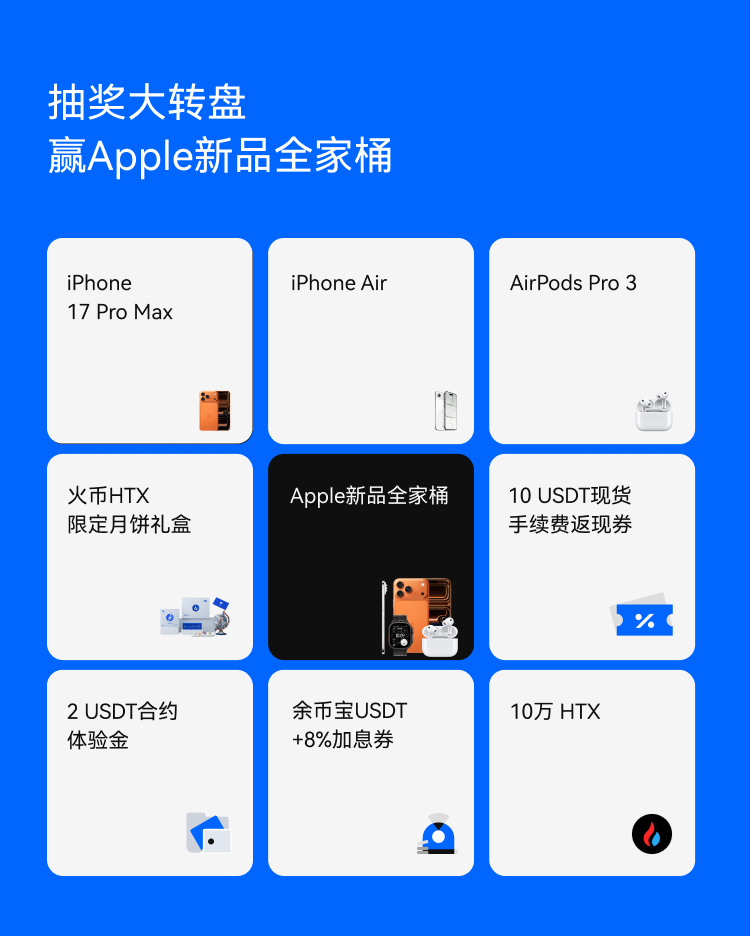 - iPhone 17 Pro Max、iPhone Air、Apple Watch Ultra 3、AirPods Pro 3、火币HTX限定月饼礼盒等实物奖励将折合等值$HTX代币形式发放。