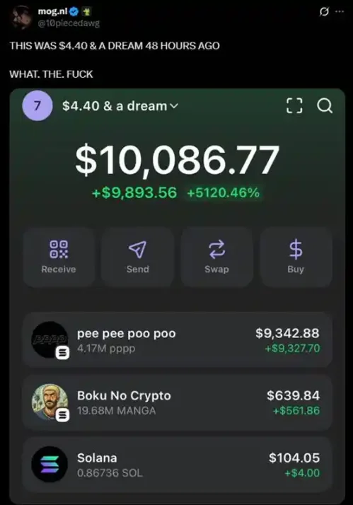 $nl 的 dev 是 @10piecedawg,一个有名气的链上玩家,出名战绩是 48 小时从 4 美元干到 1 万美元。