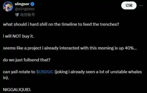 所以,niggaliquid 是在玩一场亦真亦假的「cosplay」,这很像今年初曾经破产的安然公司发币,表面上说要复兴安然,做世界上首个住宅用微型核反应堆,但实际上是一场打破次元壁的 meme 秀。(相关阅读:28 岁美国小伙,给曾经 700 亿的安然发了个币?)