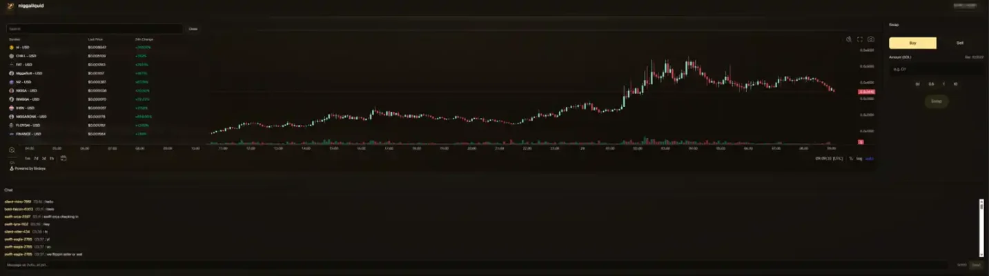 在这样的环境下,今天市值一度突破 1000 万美元的 $nl 完全可以称得上「金狗」。这个发射自 pump.fun 的币,是一个主题概念为「Solana 上的 meme 币 Perp Dex」的 meme 币。但它有趣的地方就在于,如果说它是一个纯粹的 meme 币,它又确实有一个「产品」。如果说它是一个正经做产品的项目,它的产品又绝对说不上是那种合格的「正经」,从它的全称 niggaliquid 就可以感受到。